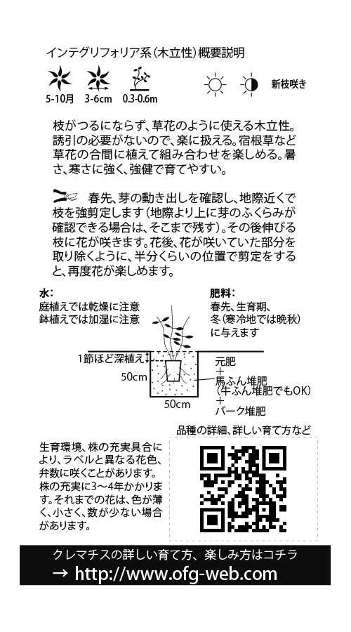 枝がつるにならず、草花のように使える木立性。誘引の必要がないので、楽に扱える。宿根草など草花の合間に植えて組み合わせを楽しめる。暑さ、寒さに強く、強健で育てやすい。