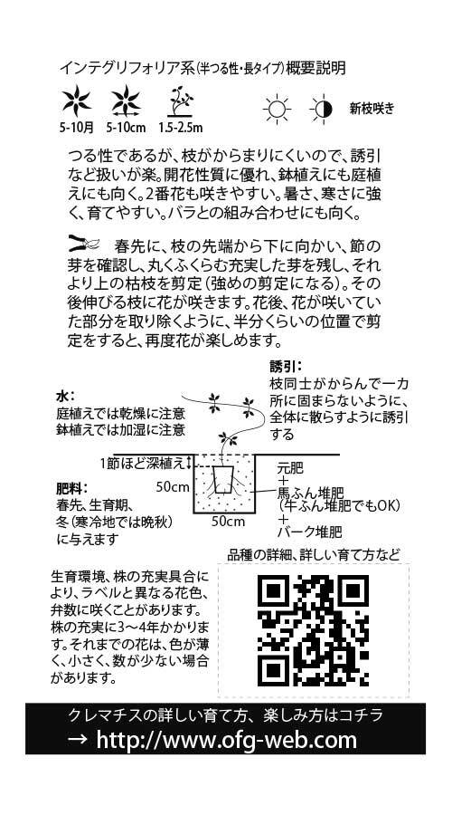 つる性であるが、枝がからまりにくいので、誘引など扱いが楽。開花性質に優れ、鉢植えにも庭植えにも向く。2番花も咲きやすい。暑さ、寒さに強く、育てやすい。バラとの組み合わせにも向く。